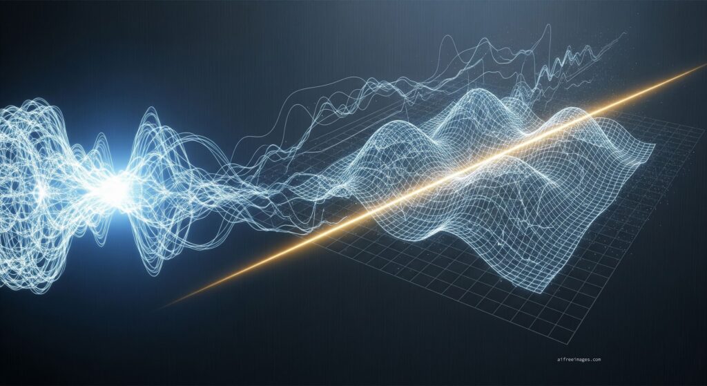 A striking abstract visualization representing complex data optimization and problem-solving, indicative of advanced artificial intelligence capabilities. Dynamic blue waveforms emanate from a central point of light, symbolizing the processing of intricate information, while a bright golden line cuts through, representing a clear, optimized path or solution achieved through sophisticated algorithms. This image effectively illustrates concepts of AI breakthroughs, mathematical optimization, and the future of data science.