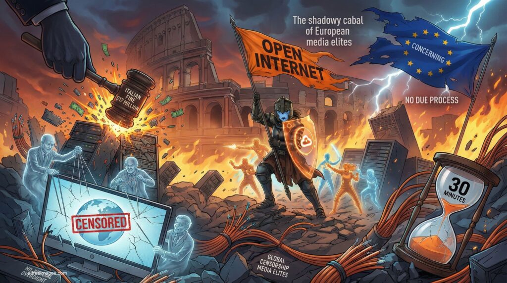 A dynamic comic book style conceptual illustration depicting a battle for internet freedom. A central warrior figure holds an “OPEN INTERNET” flag and a cloud shield, defending against a giant gavel labeled “ITALIAN FINE $17 MILLION” that is smashing server racks in front of a burning Roman Colosseum background. Ghostly figures labeled “shadowy cabal of European media elites” manipulate a computer screen stamped “CENSORED”. A tattered European Union flag reads “CONCERNING,” and an hourglass displays “30 MINUTES.” Text overlays include “NO DUE PROCESS” and “GLOBAL CENSORSHIP MEDIA ELITES.” The image illustrates the conflict between technology providers and regulatory bodies regarding online content and due process.