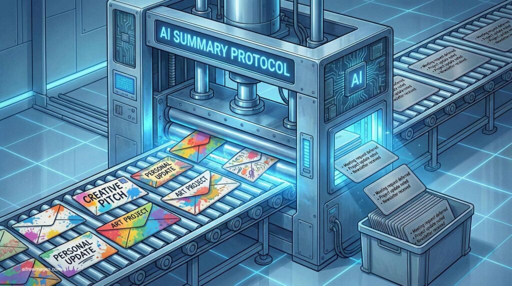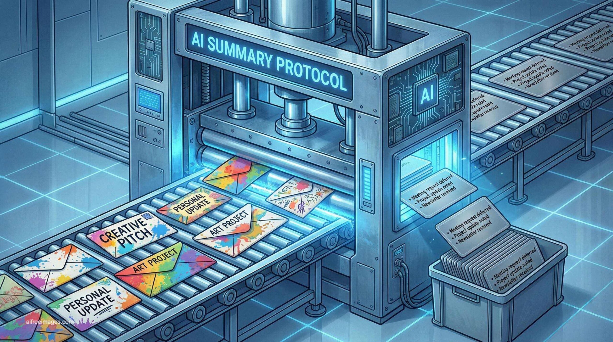A futuristic, stylized illustration depicting a machine labeled “AI SUMMARY PROTOCOL” processing creative content. Colorful, uniquely designed email envelopes with titles like “Creative Pitch” and “Art Project” are fed on a conveyor belt into the machine, which then outputs identical, standardized gray cards containing generic, bulleted text summaries. This visual commentary highlights the potential for artificial intelligence to reduce individual expression and creativity in digital communication, favoring uniformity and efficiency.