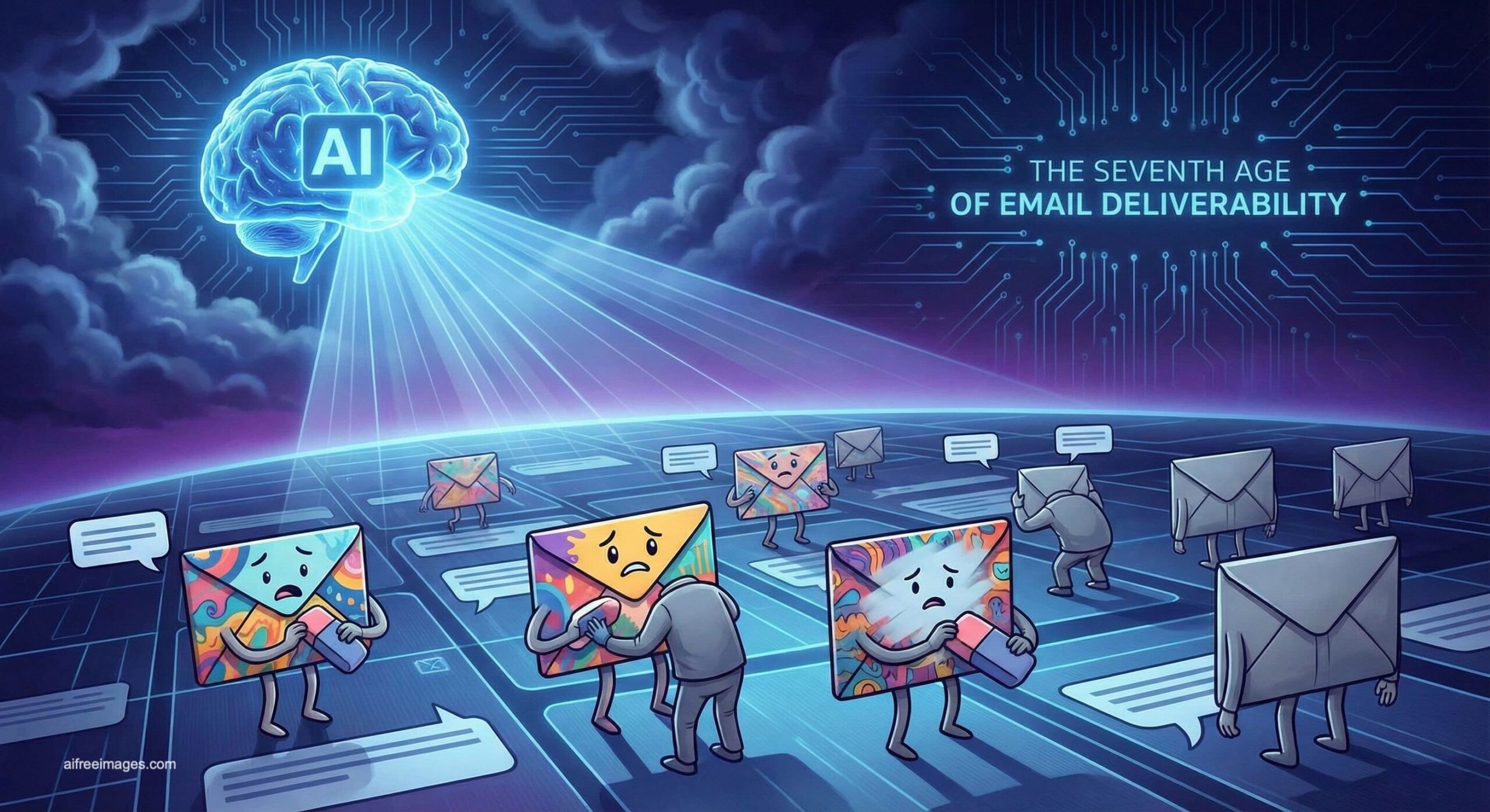 A futuristic, stylized illustration depicting a machine labeled “AI SUMMARY PROTOCOL” processing creative content. Colorful, uniquely designed email envelopes with titles like “Creative Pitch” and “Art Project” are fed on a conveyor belt into the machine, which then outputs identical, standardized gray cards containing generic, bulleted text summaries. This visual commentary highlights the potential for artificial intelligence to reduce individual expression and creativity in digital communication, favoring uniformity and efficiency.