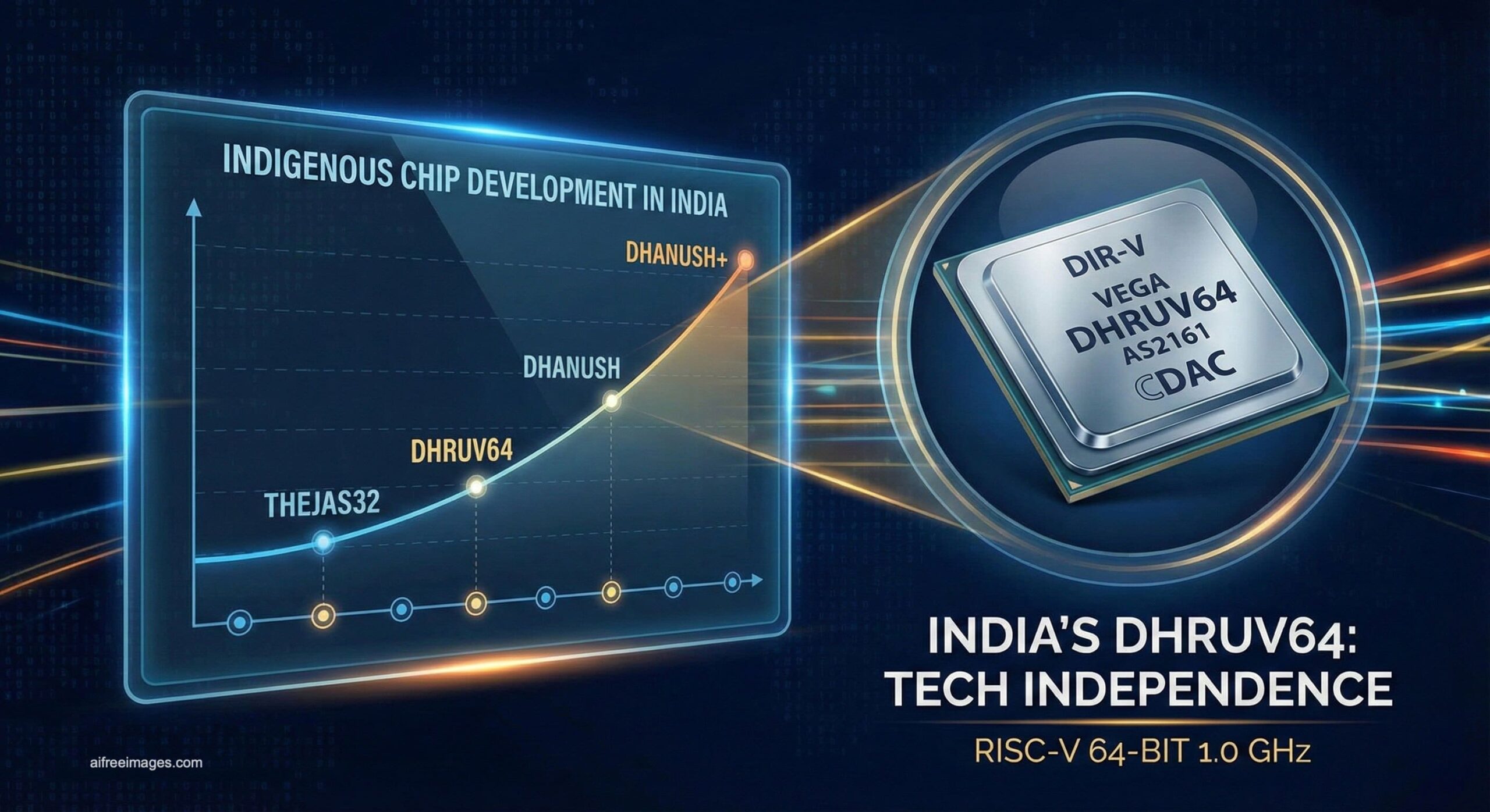 A high-tech 3D illustration featuring a close-up of a modern RISC-V architecture microprocessor, symbolizing India’s push for technological independence. The background integrates a digital evolution graph and technical schematics, representing the development of indigenous semiconductor technology and the performance growth of chips like the DHRUV64.