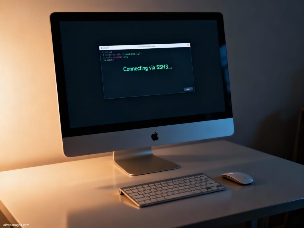 A cinematic, conceptual image of a modern desktop computer setup, featuring a high-definition monitor on a clean desk with a sleek keyboard and mouse. The screen displays a terminal window with the message “Connecting via SSH3…”, representing the next evolution in secure network protocols. The focused, low-light environment creates a high-tech and sophisticated atmosphere, perfect for articles on cybersecurity, network administration, the future of internet protocols, and advanced computing.