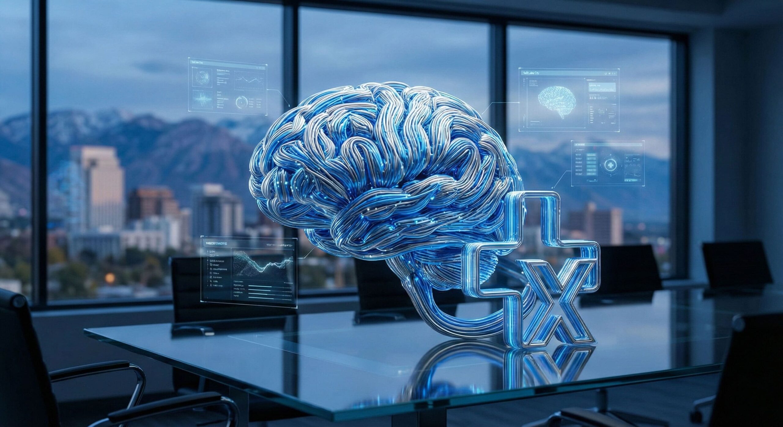 A futuristic 3D visualization of a human brain and a medical cross symbol formed by interwoven, glowing blue fiber optic cables. The digital sculpture rests on a reflective glass conference table, surrounded by floating holographic data screens. The background features a blurred view of a city skyline (resembling Salt Lake City) and mountains through a large office window at dusk. The image represents concepts of artificial intelligence in healthcare, digital medicine, neurology, and advanced technology.