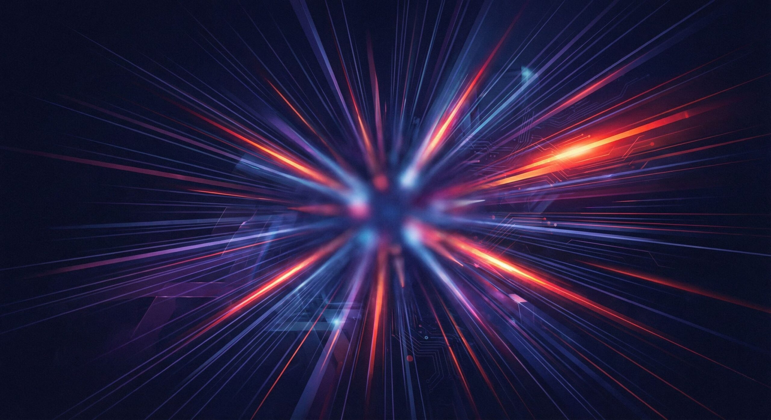 An abstract digital illustration depicting the rapid acceleration of data at the network edge. A central, blurred nexus bursts outward into sharp streaks of neon light moving toward the viewer, resembling a sci-fi warp drive or instantaneous transfer. The color palette is dominated by deep blues and purples, punctuated by intense flashes of fiery red and orange signifying processing speed and energy. This minimalist tech background represents future technology, cyberspace, and high-speed internet connection.