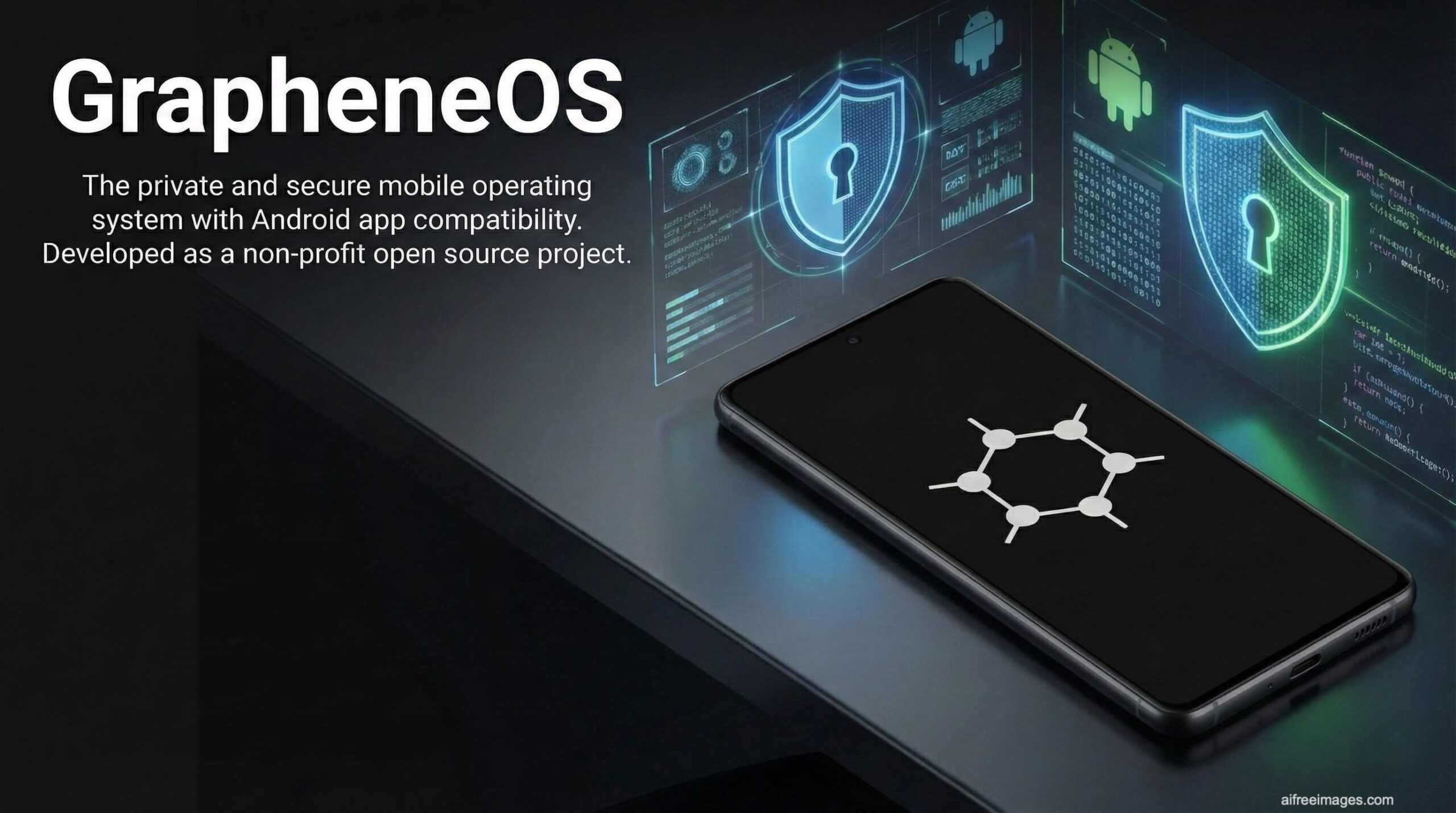 A high-quality illustration of a sleek, modern smartphone lying on a dark surface, displaying the white hexagonal GrapheneOS logo on its screen. The device is surrounded by glowing, holographic cybersecurity symbols—including digital shields, padlocks, and scrolling source code—symbolizing military-grade encryption and data privacy. This concept image represents the security and open-source nature of the GrapheneOS mobile operating system.