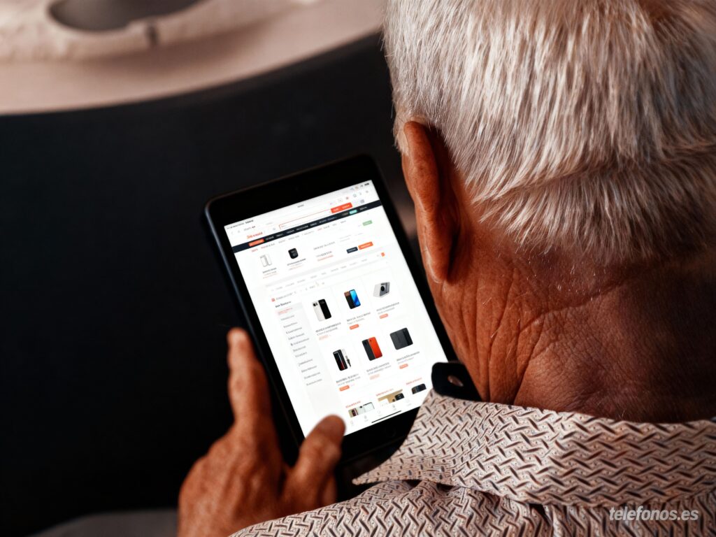 An over-the-shoulder shot of a senior man with white hair browsing an e-commerce website on a tablet. He is actively engaged in online shopping, scrolling through a product page for electronics. This image is perfect for illustrating themes of technology adoption by seniors, e-commerce, digital literacy for the elderly, and modern retirement lifestyles.