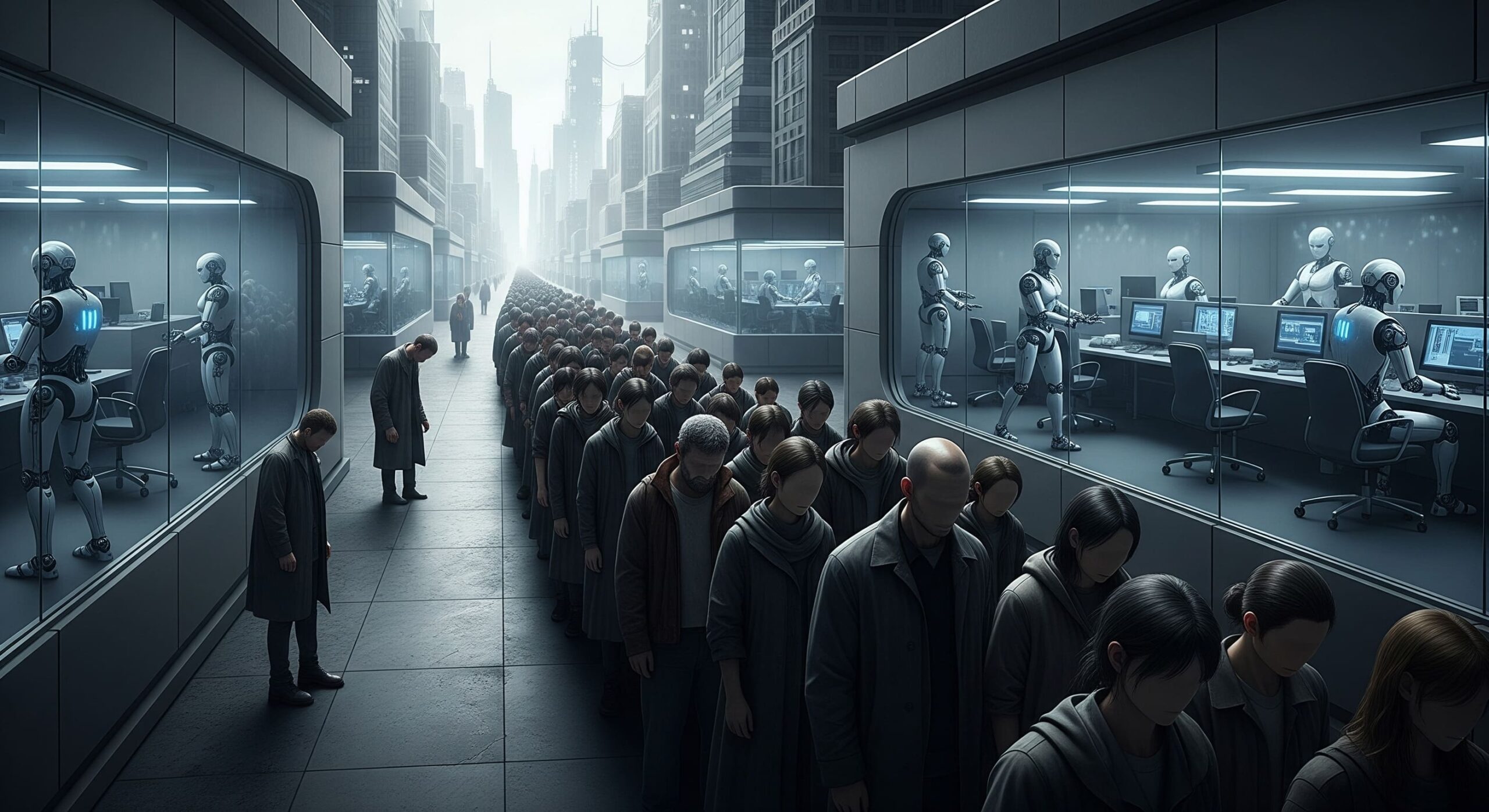 A powerful and bleak conceptual image depicting a dystopian future shaped by artificial intelligence. A long, winding queue of dejected and anonymous people stands idle, symbolizing mass unemployment and a loss of dignity. They are contrasted with the brightly lit offices on either side, where efficient humanoid robots have taken over their jobs. The cold, sterile architecture and desaturated colors enhance the feeling of despair and dehumanization, serving as a potent visual metaphor for the societal risks of unchecked automation.